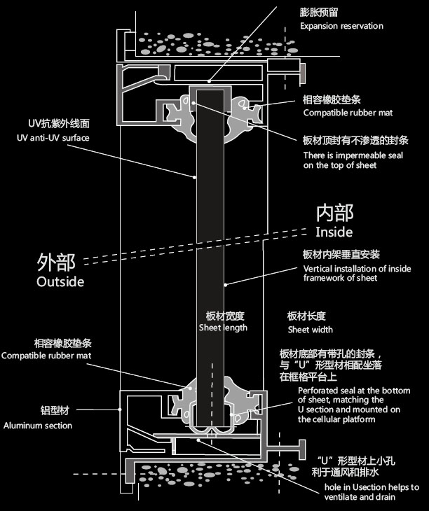 d. PC板應順骨架方向安裝,使水滴下滑。板頂邊應用防滲防塵鋁箔帶密封。板底邊用特制有孔透水式鋁箔帶封底可使冷凝水流走。